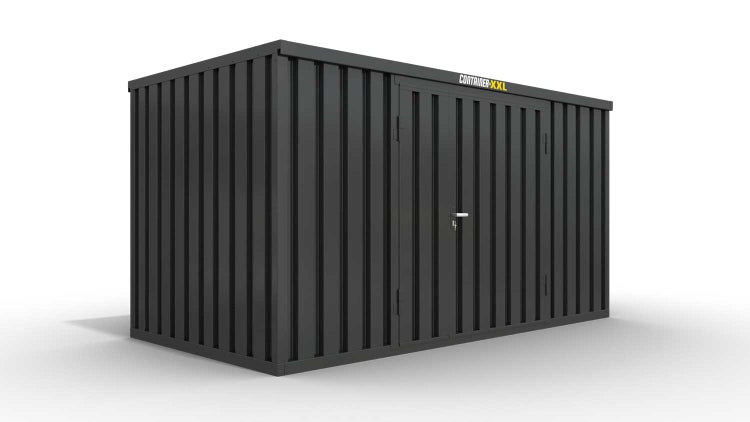 Lagercontainer Gerätehaus XXL – 12 qm, H2150 x B6080 x T2170 mm, Außenwandlackierung anthrazit, Dach außen verzinkt, mit Holzfußboden, 1830 mm Doppelflügeltür mittig in Breitseite, montiert