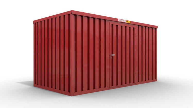 Lagercontainer Gerätehaus XXL – 12 qm, H2150 x B6080 x T2170 mm, Außenwandlackierung RAL 3000 feuerrot, Dach außen verzinkt, mit Holzfußboden, 1270 mm Einflügeltür mittig in Breitseite, montiert