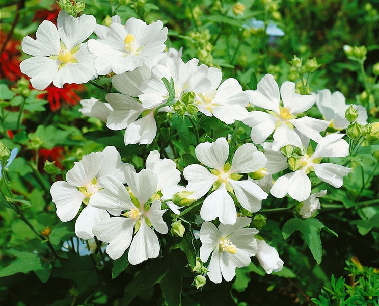 Lavatera x olbia ‘White Angel’, die edle Strauchmalve beziehungsweise Bechermalve, präsentiert sich als üppig blühender Zierstrauch mit langer Blütezeit. Von Juni bis in den Herbst öffnen sich zahlreiche, schalenförmige, reinweiße Blüten mit zartem, lichtem Zentrum, die vor dem graugrünen, leicht filzigen Laub besonders strahlend wirken. Der buschige, aufrechte Wuchs bildet einen harmonischen Gartenstrauch, der je nach Standort rasch zu einer imposanten, dennoch locker wirkenden Erscheinung heranwächst. Als Blütenstrauch setzt ‘White Angel’ im Staudenbeet, im Vorgarten oder als Solitär einen eleganten Akzent und eignet sich ebenso für die Gruppenpflanzung mit sommerblühenden Stauden wie Salvia, Perovskia oder Ziergräsern. In größeren Gefäßen macht die Sorte auch als Kübelpflanze auf Terrasse und Balkon eine hervorragende Figur; in lockeren Blühhecken kann sie als Heckenpflanze den sommerlichen Flor bereichern.