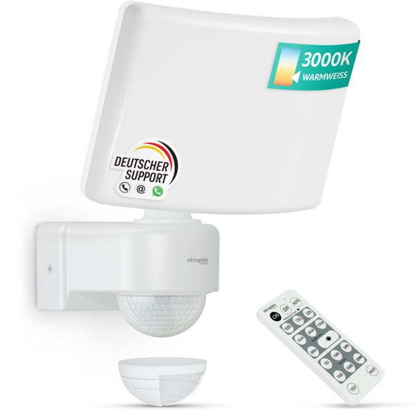 LED Außenstrahler mit Bewegungsmelder und Fernbedienung 26W 3000lm IP65 warmweiß Master Slave Funktion Wandmontage schwenkbar weiß
