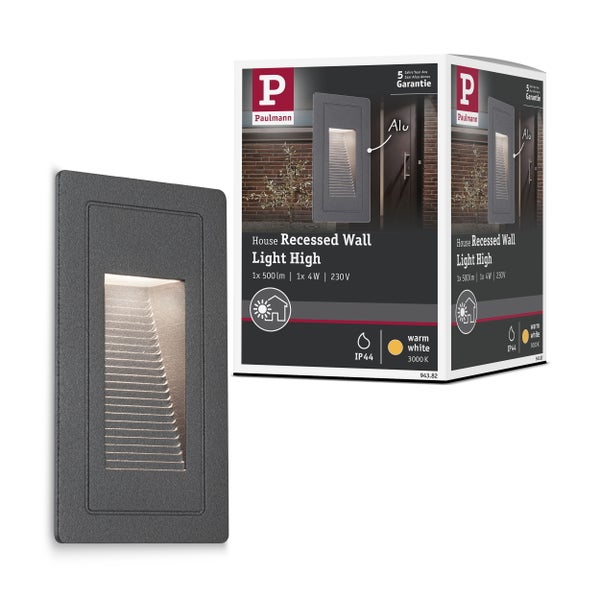 Licht muss nicht immer von der Decke kommen: Die Wandeinbauleuchte High aus Aluminium, in den Abmessungen 103x58mm, ist speziell konzipiert für den Wandeinbau, sie setzt interessante Lichteffekte und erhöht die Sicherheit durch Beleuchtung im Außenbereich. Die Leuchte, mit einer angenehmen Lichtfarbe von 3.000K, ist dank Schutzart IP44 garantiert wasserdicht und rostfrei.