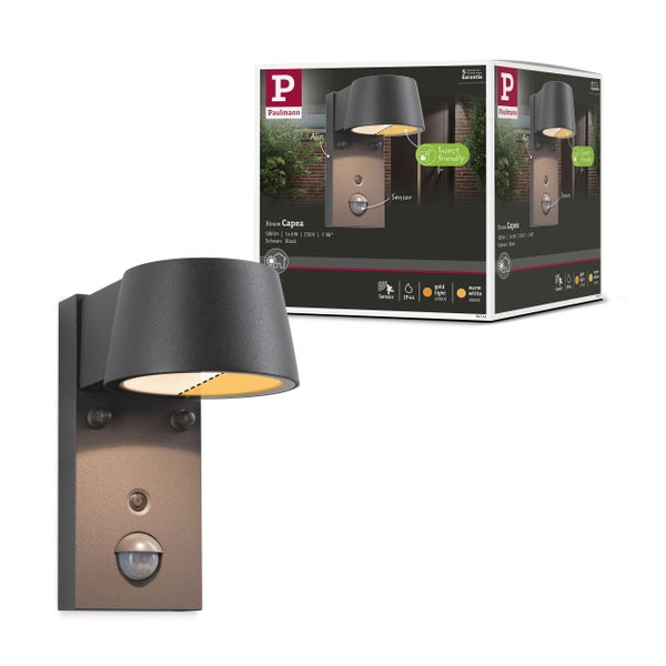 Die warmweiße LED Außenwandleuchte Capea mit einer Leistung von 6W setzt attraktive Lichteffekte und erhöht die Sicherheit durch Beleuchtung im Außenbereich. Sie bringt Licht an die Außenwände und leuchtet den Eingangsbereich gleichmäßig aus. In der Grundeinstellung leuchtet die Außenwandleuchte mit 20 % Helligkeit und 2.200 Kelvin. Sobald sich jemand annähert, wird das Außenlicht durch den verbauten Bewegungsmelder auf 100 % Helligkeit und 3.000 Kelvin geschaltet. Nach etwa 30 Sekunden wird wieder auf die gespeicherte Lichtfarbe und Helligkeit zurückgeschaltet. 2.200 Kelvin liegen außerhalb des sichtbaren Bereiches für die meisten Insekten, somit werden diese nicht von der zusätzlichen Lichtquelle angezogen und die Leuchte ist damit besonders insektenfreundlich.
