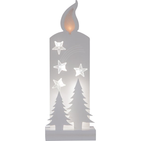 - Adventsdeko bestehend aus weißem Holz mit beleuchteten Motiven (Kerze, Tannen und Sterne). Die LEDs erzeugen eine gemütliche Atmosphäre in Ihrem Wohnbereich