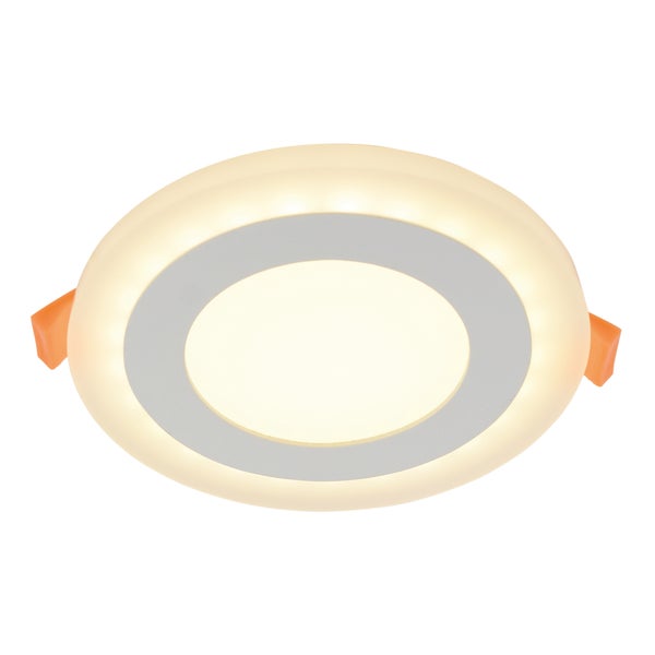 Diese Einbauleuchte aus unserer Interna-Kollektion wird Sie begeistern! Einbauleuchten passen sich harmonisch an die verschiedensten Einrichtungsstile an und sorgen für eine zurückhaltende, aber wirkungsvolle Beleuchtung. Functional Style, runde Gestaltung und eine schlichte Optik, ideal für alle, die es schlicht und edel mögen! Die Leuchte ist aus Metall und Kunststoff gefertigt und in warmweiß gehalten. Die Einbauleuchte misst 14,3 cm in der Länge, 14,3 cm in der Breite/Tiefe und 1,5 cm in der Höhe. Somit hat die Leuchte einen Durchmesser von 14,3 cm. Mit 1 LED Platine, bestückt mit 45 LED, sorgt diese Einbauleuchte für ein schönes Licht in Ihren Räumlichkeiten. Die Lichtquelle ist fest integriert. Diese Leuchte entspricht der Klasse 3. Dieses Gerät ist für den Betrieb am Stromnetz ausgelegt und funktioniert mit einer Netzspannung von 220-240V ~ 50Hz. Die 9 Watt starke Leuchte hat eine Lichtstärke von 650 Lumen und eine Lichttemperatur von 3000 Kelvin. Verleihen Sie Ihrem Zuhause mit unserer hochwertigen Einbauleuchte das perfekte Lichtambiente und genießen Sie Komfort und Stil in jedem Raum.