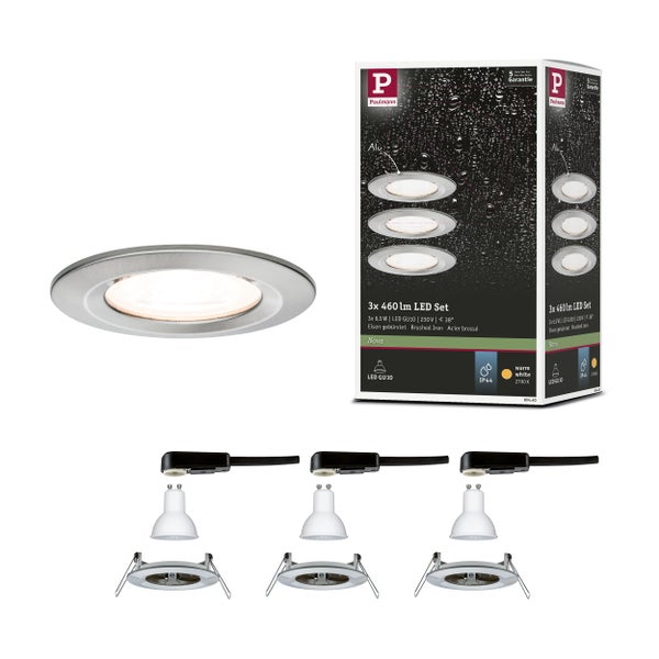 LED Einbauleuchte Nova Basisset starr IP44 rund 78mm GU10 3x6,5W 3x460lm 230V 2700K Eisen gebürstet