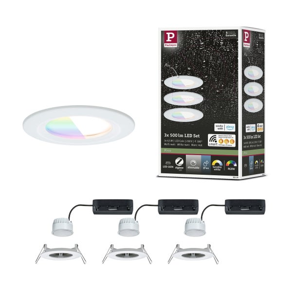 16 Millionen Farben, 16 Millionen Lichtstimmungen - Das smarte Einbauleuchten Set Nova Coin in Weiß matt mit Farbwechselfunktion schafft in jedem Raum ein individuelles Wohnambiente. Im Lieferumfang sind drei austauschbare LED-Leuchtmittel inklusive hochwertigen Alu- Einbauringen enthalten. Durch den besonders hohen IP-Schutz von IP44 eignen sich die Leuchten ideal auch für Feuchträume und sind vor Spritzwasser geschützt. Mit einer Leistung von 3x6 Watt und Zigbee 3.0-Steuerung sorgen sie für eine effiziente und innovative Beleuchtungslösung. Zigbee 3.0 ist ein Funkübertragungsprotokoll, das Geräte verschiedener Hersteller miteinander vernetzt. So lassen sich die Leuchten per App, Fernbedienung oder Sprachbefehl einzeln oder gemeinsam steuern: Ob gemütliches warmes Goldlicht (2200K), sachlich helles Tageslichtweiß (6500K) oder bunte Farbverläufe - die Kombination aus Tunable White, RGB und Dimmfunktion bietet unzählige Möglichkeiten. Einfach und bequem ist die smarte Einbauleuchte weiterhin über einen handelsüblichen Lichtschalter ein- und ausschaltbar. Der integrierte Memory-Effekt merkt sich dabei immer die zuletzt genutzte Lichteinstellung - für maximalen Komfort. Durch die Schwenkbarkeit der Leuchte lässt sich das Licht überall dort hinlenken, wo es benötigt wird. Die Montage gestaltet sich dank des verkettbaren und austauschbaren Coins, der geringen Einbautiefe von nur 45 mm und dem 230-V-Direktanschluss besonders einfach und effizient.