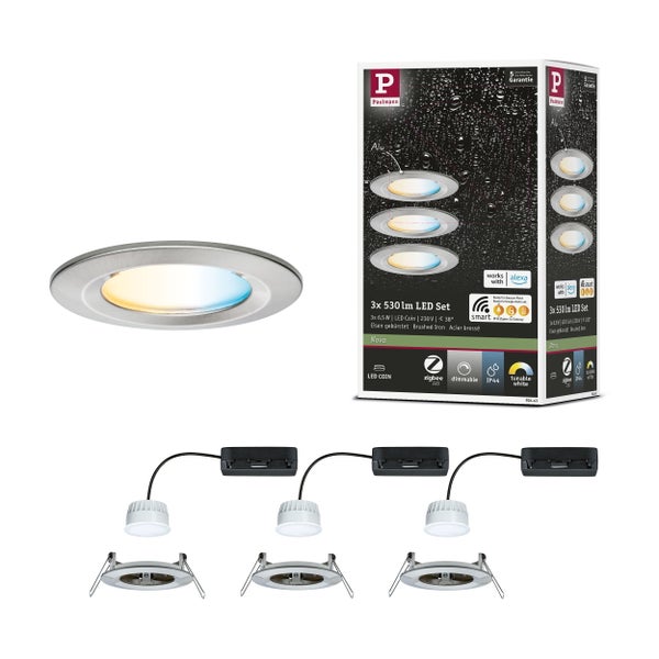 Das smarte Einbauleuchten Set Nova Coin in Eisen gebürstet mit Farbwechselfunktion schafft in jedem Raum ein individuelles Wohnambiente. Im Lieferumfang sind drei austauschbare LED-Leuchtmittel inklusive hochwertigen Alu- Einbauringen enthalten. Durch den besonders hohen IP-Schutz von IP44 eignen sich die Leuchten ideal auch für Feuchträume und sind vor Spritzwasser geschützt. Mit einer Leistung von 3x6 Watt und Zigbee 3.0-Steuerung sorgen sie für eine effiziente und innovative Beleuchtungslösung. Zigbee 3.0 ist ein Funkübertragungsprotokoll, das Geräte verschiedener Hersteller miteinander vernetzt. So lassen sich die Leuchten per App, Fernbedienung oder Sprachbefehl einzeln oder gemeinsam steuern: Ob gemütliches warmes Goldlicht (2200K) oder sachlich helles Tageslichtweiß (6500K) - über die Tunable White Funktion kann die Lichtfarbe nach Bedarf stufenlos eingestellt werden. Die stufenlose Dimmfunktion ermöglicht eine individuelle Anpassung der Helligkeit und sorgt für helles Arbeitslicht und gemütliche Wohlfühlbeleuchtung in einem. Einfach und bequem sind die smarten Einbauleuchten weiterhin über einen handelsüblichen Lichtschalter ein- und ausschaltbar. Der integrierte Memory-Effekt merkt sich dabei immer die zuletzt genutzte Lichteinstellung - für maximalen Komfort. Die Montage gestaltet sich dank des verkettbaren und austauschbaren Coins, der geringen Einbautiefe von nur 45 mm und dem 230-V-Direktanschluss besonders einfach und effizient.