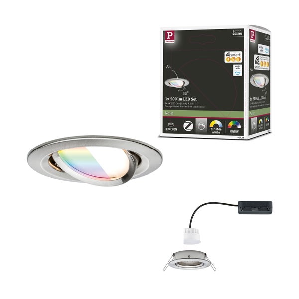 16 Millionen Farben, 16 Millionen Lichtstimmungen - Das smarte Einbauleuchten Set Nova Coin in Eisen gebürstet mit Farbwechselfunktion schafft in jedem Raum ein individuelles Wohnambiente. Im Lieferumfang ist ein hochwertiger Alu- Einbauring inklusive einem austauschbaren LED-Leuchtmittel mit einer Leistung von 6 Watt und RGBW-Zigbee 3.0-Steuerung enthalten. Zigbee 3.0 ist ein Funkübertragungsprotokoll, das Geräte verschiedener Hersteller miteinander vernetzt. So lässt sich die Leuchte per App, Fernbedienung oder Sprachbefehl einzeln oder gemeinsam steuern: Ob gemütliches warmes Goldlicht (2200K), sachlich helles Tageslichtweiß (6500K) oder bunte Farbverläufe - die Kombination aus Tunable White, RGB und Dimmfunktion bietet unzählige Möglichkeiten. Einfach und bequem ist die smarte Einbauleuchte weiterhin über einen handelsüblichen Lichtschalter ein- und ausschaltbar. Der integrierte Memory-Effekt merkt sich dabei immer die zuletzt genutzte Lichteinstellung - für maximalen Komfort. Durch die Schwenkbarkeit der Leuchte lässt sich das Licht überall dort hinlenken, wo es benötigt wird. Die Montage gestaltet sich dank des verkettbaren und austauschbaren Coins, der geringen Einbautiefe von nur 45 mm und dem 230-V-Direktanschluss besonders einfach und effizient.