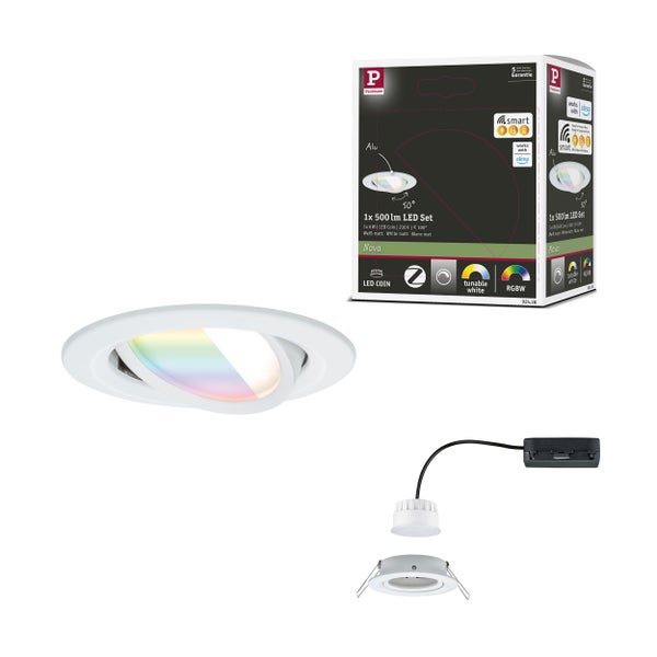 16 Millionen Farben, 16 Millionen Lichtstimmungen - Das smarte Einbauleuchten Set Nova Coin in Weiß matt mit Farbwechselfunktion schafft in jedem Raum ein individuelles Wohnambiente. Im Lieferumfang ist ein hochwertiger Alu- Einbauring inklusive einem austauschbaren LED-Leuchtmittel mit einer Leistung von 6 Watt und RGBW-Zigbee 3.0-Steuerung enthalten. Zigbee 3.0 ist ein Funkübertragungsprotokoll, das Geräte verschiedener Hersteller miteinander vernetzt. So lässt sich die Leuchte per App, Fernbedienung oder Sprachbefehl einzeln oder gemeinsam steuern: Ob gemütliches warmes Goldlicht (2200K), sachlich helles Tageslichtweiß (6500K) oder bunte Farbverläufe - die Kombination aus Tunable White, RGB und Dimmfunktion bietet unzählige Möglichkeiten. Einfach und bequem ist die smarte Einbauleuchte weiterhin über einen handelsüblichen Lichtschalter ein- und ausschaltbar. Der integrierte Memory-Effekt merkt sich dabei immer die zuletzt genutzte Lichteinstellung - für maximalen Komfort. Durch die Schwenkbarkeit der Leuchte lässt sich das Licht überall dort hinlenken, wo es benötigt wird. Die Montage gestaltet sich dank des verkettbaren und austauschbaren Coins, der geringen Einbautiefe von nur 45 mm und dem 230-V-Direktanschluss besonders einfach und effizient.