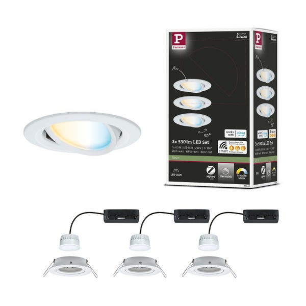 Das smarte Einbauleuchten Set Nova Coin in Weiß matt mit Farbwechselfunktion schafft in jedem Raum ein individuelles Wohnambiente. Im Lieferumfang sind drei austauschbare LED-Leuchtmittel inklusive hochwertigen Alu-Einbauringen enthalten. Durch die Schwenkbarkeit der Leuchten lässt sich das Licht überall dort hinlenken, wo es benötigt wird. Mit einer Leistung von 3x6 Watt und Zigbee 3.0-Steuerung sorgen sie für eine effiziente und innovative Beleuchtungslösung. Zigbee 3.0 ist ein Funkübertragungsprotokoll, das Geräte verschiedener Hersteller miteinander vernetzt. So lassen sich die Leuchten per App, Fernbedienung oder Sprachbefehl einzeln oder gemeinsam steuern: Ob gemütliches warmes Goldlicht (2200K) oder sachlich helles Tageslichtweiß (6500K) - über die Tunable White Funktion kann die Lichtfarbe nach Bedarf eingestellt werden. Die stufenlose Dimmfunktion ermöglicht eine individuelle Anpassung der Helligkeit und sorgt für helles Arbeitslicht und gemütliche Wohlfühlbeleuchtung in einem. Einfach und bequem sind die smarten Einbauleuchten weiterhin über einen handelsüblichen Lichtschalter ein- und ausschaltbar. Der integrierte Memory-Effekt merkt sich dabei immer die zuletzt genutzte Lichteinstellung - für maximalen Komfort.