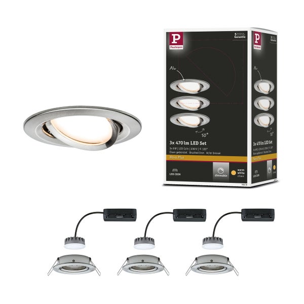 Die runden Nova Plus Einbauleuchten (3er-Set) in Eisen gebürstet mit tauschbarem LED-Coin, eignen sich sowohl für Neuinstallationen als auch für den Austausch bestehender Installationen. Sie sind besonders flach und können deshalb in Decken mit einem Hohlraum von nur 30 Millimetern eingebaut werden. Durch die Verkettung der Einzelleuchten mittels Schnellklemmen, lassen sie sich schnell und einfach einbauen. Die Dimmfunktion ermöglicht eine individuelle Anpassung der Helligkeit und sorgt für warmweißes Arbeitslicht und gemütliche Wohlfühlbeleuchtung in einem. Dank der Schwenkbarkeit kann der Spot individuell ausgerichtet werden.