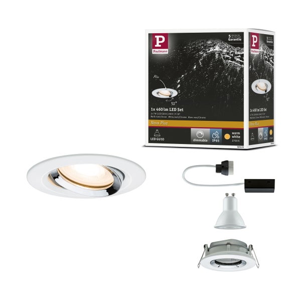 LED Einbauleuchte Nova Plus Einzelleuchte schwenkbar IP65 rund 93mm 30° GU10 7W 460lm 230V dimmbar 2700K Weiß matt, Chrom