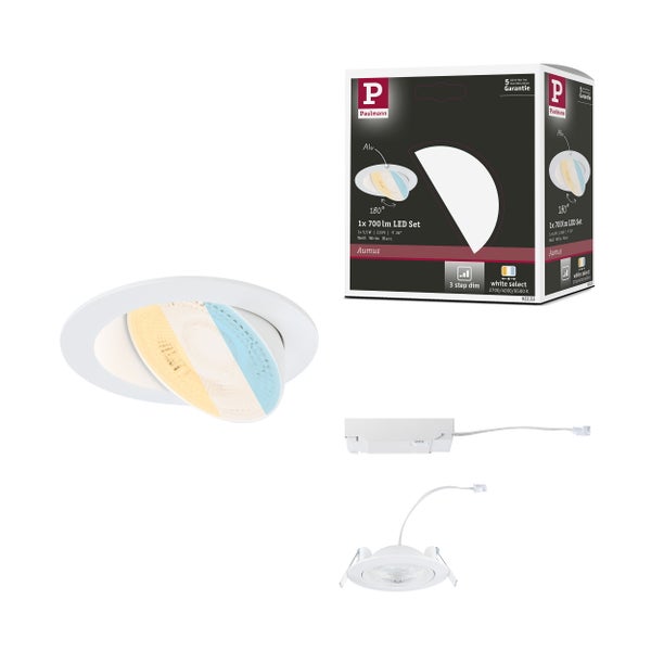 Die Einbauleuchte Aumus in Weiß setzt mit ihrer Schwenkbarkeit von bis zu 180° und einer minimalen Hohlraumtiefe von nur 35 mm neue Standards in der Beleuchtungstechnik. Vor der Installation kann aus drei Optionen (2700 K, 4000 K oder 6500 K) per Dip-Schalter die individuelle Lichtfarbe ausgewählt werden, dank der White-Select-Funktion. Zudem bietet die Einbauleuchte eine praktische 3-Step-Dimm-Funktion, mit der das Dimmlevel in drei Stufen (100%, 50%, 25%) mit einem herkömmlichen Wandschalter angepasst werden kann. Dank der innovativen Anschlussbox lässt sich die Einbauleuchte ohne Werkzeug innerhalb von wenigen Sekunden montieren. Mit ihrem ansprechenden Design und innovativer Technologie ist die Einbauleuchte die optimale Wahl für jeden Raum, in dem eine flexible und effektive Beleuchtungslösung gefragt ist.