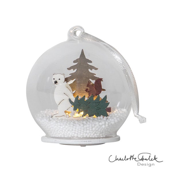 LED-Glaskugel ,Forest Friends', mit Aufhängung, Tiermotive aus Holz, Eisbär
