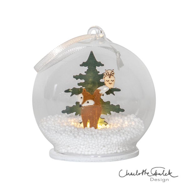 LED Glaskugel ,Forest Friends', mit Aufhängung, Tiermotive aus Holz, Fuchs