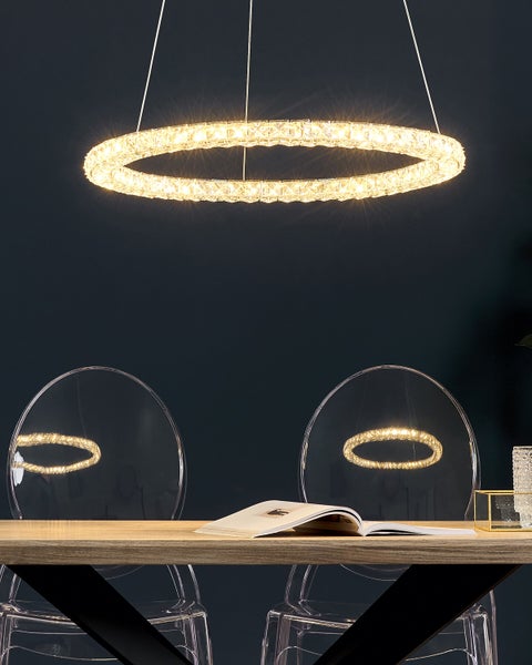 Moderne, kreisförmige LED Hängelampe aus Kristallglas in Silber . Mit dieser runden, eleganten Pendelleuchte können Sie einen schimmernden Effekt in Ihrer Einrichtung erzeugen und dabei einen warmweißen Lichtschein genießen. Der horizontal aufgehängte LED-Ring besteht aus hochwertigem Metall, das für Langlebigkeit und Haltbarkeit der Lampe sorgt. Die Leuchte verfügt über dekorative Elemente aus Kristallglas, die jedem modernen oder traditionellen Dekor einen glamourösen Touch verleihen. Dank langen, transparenten Kabeln eignet sich die Hängeleuchte perfekt für Flur, Ess-, Wohn- und Schlafzimmer. Details: Typ Pendelleuchten. Stil: Modern. Farbe: Silber. Lichtfarbe: Warmweiß. Material: Metall. Material: Stahl. Material Lampenschirm: Kristall. Verstellbar: Kabellänge. Fassung: 35 W. Finish: Glänzend. Schutzklasse: IP 20. Lichtstrom: 1750. LED Typ: SMD 2835. LED: Ja. Anzahl der Glühbirnen: 1. Spannung 230 V (50 Hz). Abmessungen: Kabellänge: 180 cm. Tiefe: 60 cm. Breite: 60 cm. Höhe: 142 cm. Gewicht: 4 kg. .Sie kaufen: 1 x Hängeleuchte. Produktvorteile: Geeignet für Küche, Esszimmer oder Bar, Kabellänge einstellbar, Sorgt für eine gleichmäßige Beleuchtung des Raumes, Elegantes Design, Mit integrierter LED Beleuchtung. Montage: Installation benötigt.5 - 15 Min. Zusatzinformationen: Die Stromkabel dürfen nur von einem qualifizierten Elektriker angepasst werden. Pflegeanleitung: Kristall: 1.Bitte ausschließlich milde Reinigungsmittel bzw. Glasreiniger und weiche Tücher verwenden. Feuchte Stellen mit einem weichen Tuch trocken reiben. 2.Keine scheuernden Reinigungsmittel nutzen, da diese die Oberfläche beschädigen können. Stahl: 1.Vermeiden Sie scheuernde Reiniger, da diese die Oberfläche beschädigen können. 2.Bitte ausschließlich handelsübliche, milde Reinigungsmittel und weiche Tücher verwenden, wobei feuchte Stellen sofort trocken gerieben werden sollten. 3.Bei Chrom und Kupfer regelmäßig mit speziellen Pflegemitteln polieren.