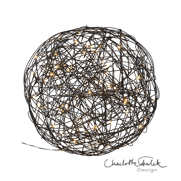 - LED Kugel für den Garten bestehend aus dekorativ ineinander gewickeltem, schwarzen Draht und einer transparenten Kunststoff-Lichterkette mit 100 LEDs (3,6 Watt)