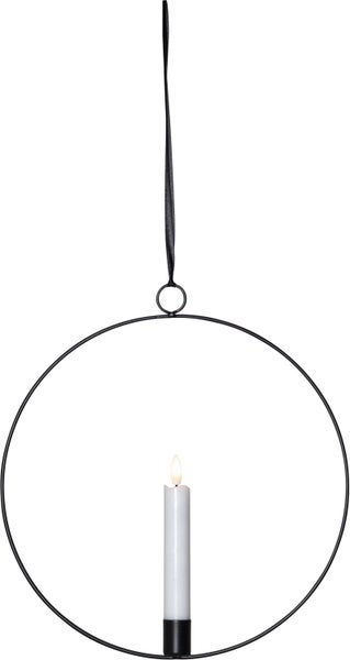 - Material: Ring und Kerzenhalterung aus Metall in Schwarz, Kerze aus Echtwachs in weiß, Flamme aus Kunststoff, textiles Band zur Befestigung