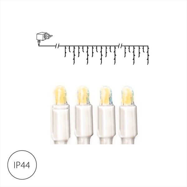 - LED Lichtervorhang Eisregen bestehend aus mehreren transparenten Kabeln mit insgesamt 100 LEDs (16 Watt) im Abstand von 10 cm. Die extra kleinen Lampen sorgen für einen schlanken Look
