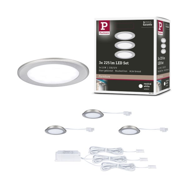 LED Möbeleinbauleuchten 3er-Set rund 65 mm 3x2,5W 3x180lm 230/12V 4000K Eisen gebürstet