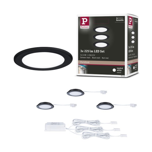 LED Möbeleinbauleuchten 3er-Set rund 65mm 3x2,5W 3x180lm 230/12V 4000K Schwarz matt
