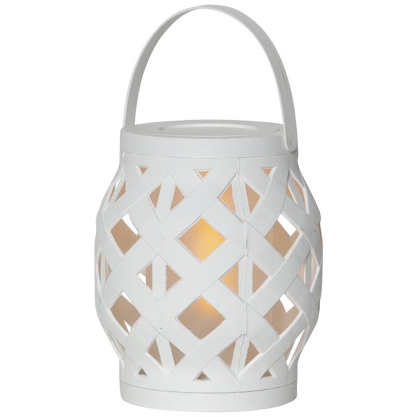 - Die moderne Dekorations-Laterne besteht aus weißem Kunststoff in klassischem Laternen-Design mit Henkel, in welches kleine Cut-Outs in Form von Rauten eingearbeitet wurden