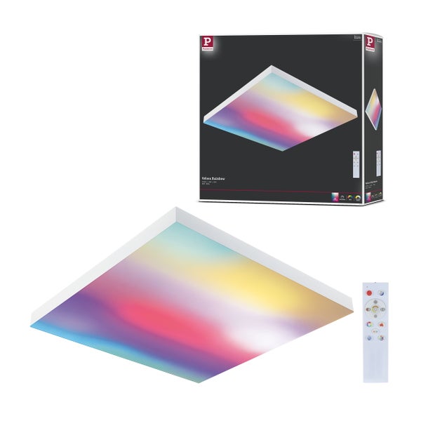 Spektakuläre Lichteffekte im Wohnraum - Das LED Panel Velora Rainbow in Weiß in der Größe 450x450mm verbindet hervorragende Raumbeleuchtung mit purer Farbmagie, denn hier wurden beste Lichteigenschaften mit dynamischen Farbeffekten neu kombiniert. Die Farbtemperatur ist per Fernbedienung stufenlos von 3000 K warmweißem bis 6500 K tageslichtweißem Licht einstellbar und kann bei entsprechender Einstellung den natürlichen Biorhythmus unterstützen. Das LED Panel überzeugt zudem mit 16 voreingestellten Animationen und dynamischer Farbsteuerung, die so nur mit flächigem Licht möglich sind. Jede Licht-Szene kann in der Geschwindigkeit angepasst oder als Standbild eingefroren werden. So entsteht eine einzigartige und individuelle Lichtinszenierung. Das LED Panel Velora Rainbow ist stufenlos dimmbar und hat eine integrierte Nachtlichtfunktion. Die hochwertige mattierte Lichtfläche und das randlose, elegante Design zeichnen das Panel aus. Die Installation an Wand oder Decke erfolgt über einen Schweberahmen.