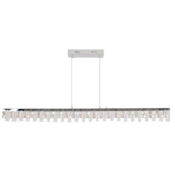 Die DIAMONDS Pendelleuchte aus unserer Kollektion ist ein echter Hingucker für jeden Wohnraum. Mit Pendelleuchten schaffen Sie eine klare und fokussierte Beleuchtung - ideale Beleuchtung für Esstische, Kücheninseln, Arbeitsbereiche oder jeden Bereich, der zielgerichtetes Licht benötigt. Sie helfen, eine bestimmte Zone hervorzuheben und schaffen eine klare Lichtquelle für Tätigkeiten. Diese Leuchte im Modern Style überzeugt mit ihrer auffälligen Optik und der länglichen Gestaltung - optimal für alle, die das Besondere lieben. Die Leuchte in chrome aus Metall und Glas ist ein echter Blickfang in jedem Raum. Die Verbindung aus verchromtem Gestell und dem verchromten Schirm ergibt ein geschmackvolles Gesamtbild. Die Pendelleuchte misst 120 cm in der Länge, 8 cm in der Breite/Tiefe und 80 cm in der Höhe. Die Pendellänge ist 80 cm. Das Leuchtmittel wird bei Bedarf von einem Fachmann getauscht. Diese Leuchte entspricht der Klasse 1. Für den Netzbetrieb dieses Geräts wird eine Netzspannung von 220-240V ~ 50Hz benötigt. Die 30 Watt starke Leuchte liefert Ihnen 2400 Lumen um den Raum zu erhellen. 3000 Kelvin Lichttemperatur ergeben eine angenehme und funktionelle Beleuchtung. Mit unserer Pendelleuchte verleihen Sie Ihrem Zuhause das perfekte Lichtambiente und sorgen für ein attraktives Ambiente.