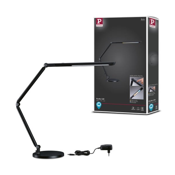 Die LED Schreibtischleuchte FlexBar in Schwarz ist durch die drei Gelenke maximal beweglich und leuchtet einen großen Bereich aus. Die Lichtfarbe lässt sich mit der White Switch-Funktion in drei Stufen einstellen und das Licht lässt sich mit dem Touchdimmer herunterdimmen.