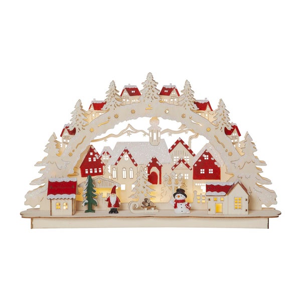 LED Schwibbogen ,Rosenheim' aus Holz mit Weihnachtsfiguren, Batterien + Timer, natur, warmweiß, B 46cm