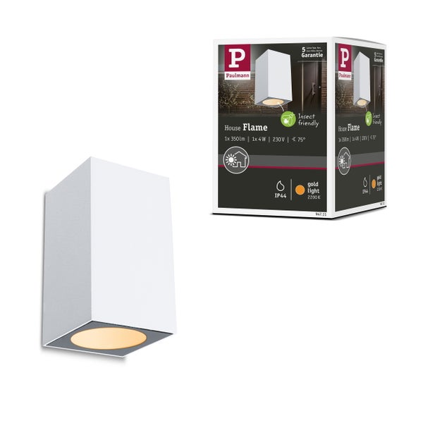 Die Außenwandleuchte Flame in Weiß bringt Licht an Außenwände. Sie trägt zur besseren Orientierung in der Dunkelheit bei und sorgt für mehr Sicherheit. Die Leuchte mit einer Lichtfarbe von 2.200 K ist besonders insektenfreundlich, denn dieser Wert liegt außerhalb des sichtbaren Bereiches für Insekten, somit werden diese nicht von der zusätzlichen Lichtquelle angezogen. Sie schützt die Insekten aktiv, ohne dabei den Nutzen für den Menschen zu vernachlässigen. Das warme Goldlicht schafft eine angenehme Stimmung rund ums Haus. Zudem ist sie robust und dank effizienter LED-Technik sehr wartungsarm und langlebig.