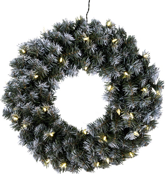 - LED Türkranz bestehend aus künstlichen Tannenzweigen in Grün mit weißen Schnee-Spitzen und einer Lichterkette mit 30 LEDs