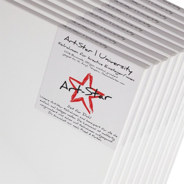 Art-Star University: Bespannte Leinwände auf Keilrahmen in solider Einsteigerqualität. Malfertige bespannte weiße blanko Leinwände auf Keilrahmen | Keilrahmenprofil: 17x26mm (HxB) ab Format 30x60cm und 15x25mm (HxB) bei kleineren Formaten| Leinwandtuch: ±280g/m² 100% Baumwolle | malfertig vorgrundiert | 8 Holzkeile zur individuellen Anpassung der Gewebespannung durch Auskeilen nach Bedarf.