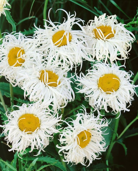 Leucanthemum x superbum ‘Old Court’, die edle Garten-Margerite, ist eine charakterstarke Blütenstaude für sonnige Gartenbereiche und klassische Staudenbeete. Diese Sorte begeistert mit großen, dicht gefüllten, cremeweiß bis reinweiß erscheinenden Blüten, deren fransig-geschichtete Zungenblätter einen lebhaften, anemonenartigen Eindruck erzeugen; die goldgelbe Mitte sorgt für ein strahlendes Zentrum. Die lange Blütezeit erstreckt sich in der Regel von Juni bis August und verleiht Rabatten, Bauerngärten und dem Vorgarten über Wochen eine frische, klare Note. Der Wuchs ist aufrecht, horstig und kompakt-buschig, wodurch ‘Old Court’ sowohl in der Gruppenpflanzung als auch als Solitär zuverlässig wirkt. Das sattgrüne, lanzettliche Laub unterstreicht den eleganten Charakter des Zierstauden-Klassikers und bildet einen attraktiven Kontrast zu den leuchtenden Blüten. Als Gartenstaude eignet sich Leucanthemum x superbum ‘Old Court’ hervorragend für das Staudenbeet, gemischte Bordüren und die Verwendung als Schnittblume in der Vase; ebenso macht sie als Kübelpflanze auf Terrasse oder Sitzplatz eine gute Figur, wo ihre klare Farbwirkung moderne wie ländliche Gestaltungen ergänzt. Ein sonniger Standort mit durchlässigem, humosem, nährstoffreichem und gleichmäßig frischem Boden fördert Vitalität und reiche Blüte; Staunässe wird nicht vertragen. Regelmäßiges Ausputzen der Verblühten verlängert die Blühdauer, ein Rückschnitt nach der Hauptblüte regt eine Nachblüte an. Eine Teilung des Horstes alle paar Jahre hält die Staude vital und kompakt, sodass diese bewährte Blütenstaude dauerhaft Freude im Garten bereitet.
