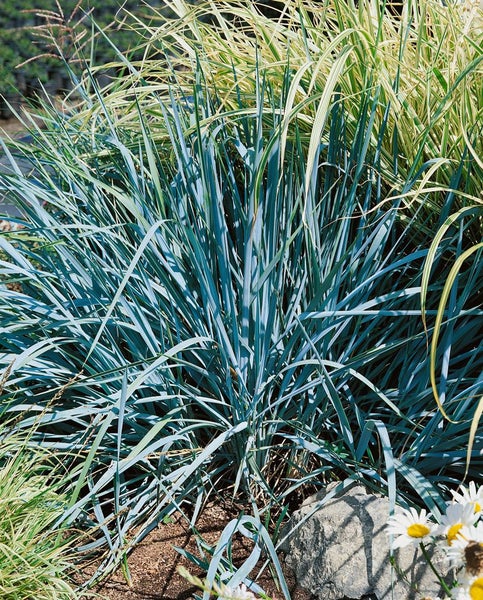 Leymus arenarius ‘Blue Dune’, der Blaue Strandroggen (auch Strandhafer genannt), ist ein ausdrucksstarkes Ziergras mit markant blau bis stahlblau bereiftem Laub, das jedem Beet sofort eine maritime, moderne Note verleiht. Diese robuste Staude bildet elegante, leicht überhängende Blattschöpfe und entwickelt im Sommer aufrechte, beige bis silbrige Blütenähren, die dem Garten eine klare Struktur und grafische Wirkung geben. ‘Blue Dune’ wächst kräftig, horstig bis ausläuferbildend, und erreicht je nach Standort mittlere bis höhere Wuchshöhen, wodurch sie als Solitär ebenso überzeugt wie in Gruppenpflanzung. Ideal geeignet ist dieses Ziergras für Steingarten, Kiesgarten, Präriebeet und Vorgarten, aber auch in große Gefäße als Kübelpflanze auf Terrasse oder Dachgarten, wo man die Vitalität gut lenken kann.