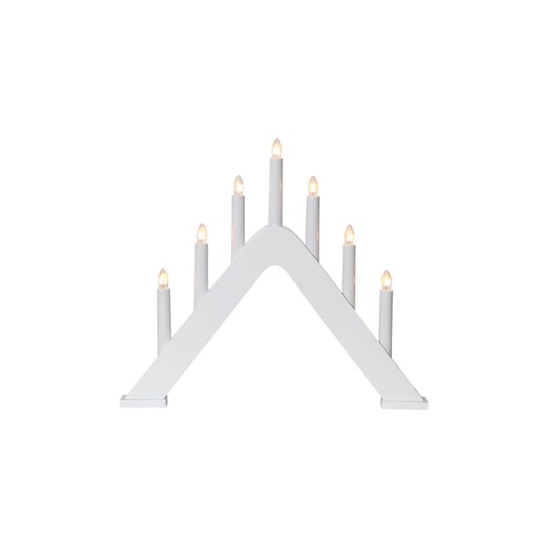 - Der Kerzenleuchter Jarve besteht aus einer weißen Holz-Basis in klassischer Dreiecks-Form, auf der sich sieben weiße Kerzen befinden