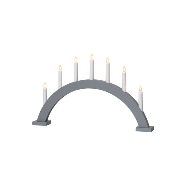 - Der Kerzenleuchter Trapp besteht aus einer grauen Basis in zeitloser Schwibbogen-Form, auf der sich sieben weiße Kerzen befinden