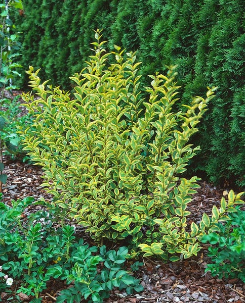 Ligustrum ovalifolium ‘Aureum’, der Gold-Liguster oder ovalblättrige Liguster, ist ein dekorativer Zierstrauch mit leuchtendem Blattschmuck und zuverlässiger Strukturwirkung im Garten. Seine elliptischen, glänzenden Blätter zeigen eine attraktive gelb-goldene Panaschierung mit grünem Zentrum, die in sonnigen Lagen besonders intensiv ausfällt. Der robuste Blütenstrauch wächst dicht, aufrecht bis breitbuschig und erreicht je nach Schnitt 2 bis 3 Meter Höhe. Im Frühsommer erscheinen zarte, cremeweiße Blütenrispen mit leichtem Duft, gefolgt von dekorativen, schwarz glänzenden Beeren; das Laub ist in milden Lagen halbimmergrün bis nahezu immergrün und sorgt ganzjährig für Farbe. Als Heckenpflanze überzeugt ‘Aureum’ durch schnelle Entwicklung, hohe Schnittverträglichkeit und eine geschlossene, blickdichte Wand, eignet sich aber ebenso als Gartenstrauch für Gruppenpflanzungen, als Solitär im Vorgarten oder als formschönes Kübelgehölz auf Terrasse und Balkon. Der Standort kann sonnig bis halbschattig sein; je mehr Sonne, desto intensiver die goldgelbe Zeichnung. Anspruchslos im Boden, gedeiht der Strauch in normaler, durchlässiger, humoser Gartenerde, verträgt auch kalkhaltige Substrate und städtisches Klima, sollte jedoch vor Staunässe geschützt werden. Regelmäßiger Rückschnitt fördert die Verzweigung und hält die Hecke kompakt, ein bis zwei Formschnitte pro Jahr sind ideal. In Trockenperioden ist ergänzendes Wässern sinnvoll, eine mulchauflage bewahrt die Bodenfeuchte. Der Gold-Liguster ist eine vielseitige, langlebige Wahl für strukturgebende Hecken, farbstarke Beeteinfassungen und pflegeleichte Blattschmuckgehölze.