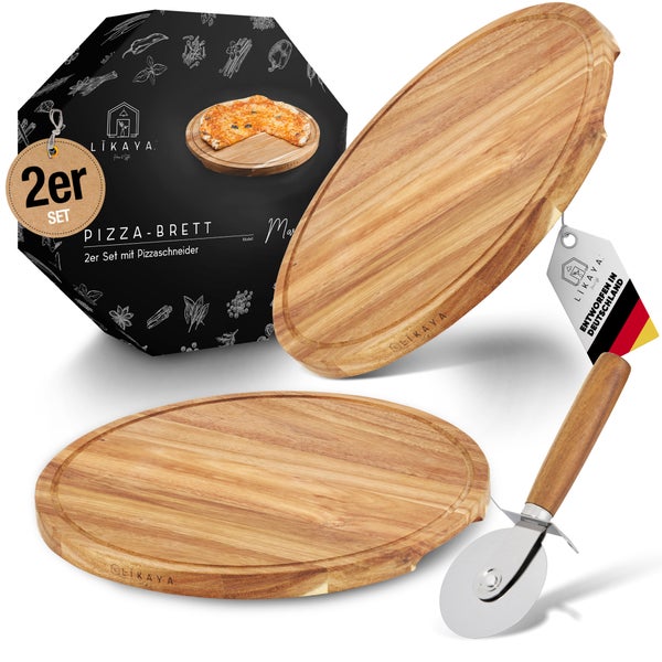 LIKAYA® Pizzabrett/Pizzateller 2er-Set rund ⌀35cm – FSC-Akazienholz mit Pizzaschneider | Perfekt für Pizza, Kuchen, Brotzeit & Käseplatte