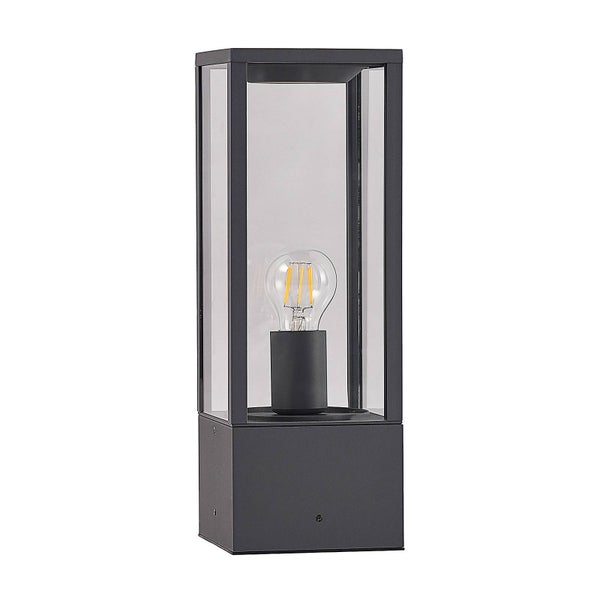 Peldar ist eine Sockelleuchte, die sich in einem dunklen Design präsentiert. Das Gehäuse wurde aus Aluminium hergestellt und mit dunkelgrauem Finish überzogen. Aufgrund von Glaseinsätzen hat man von allen Seiten einen freien Blick auf das einzusetzende Leuchtmittel.