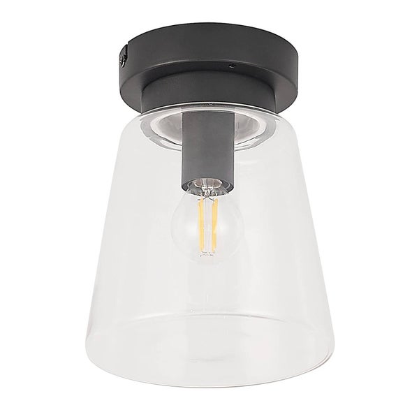 Die Deckenleuchte Carmalin wurde aus Stahl hergestellt und mit einem schwarzen Finish versehen. Der Leuchtenschirm besteht aus transparentem Glas und erlaubt dem Licht, sich frei im Raum zu entfalten.