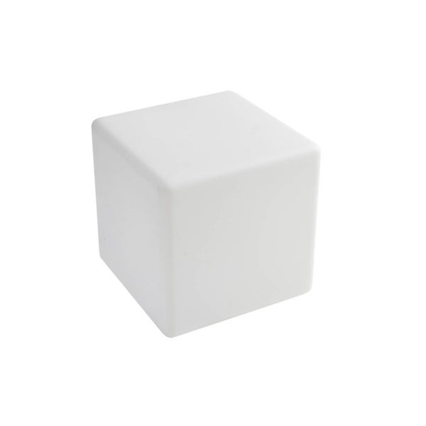 Terrassenleuchte Cubara ist aus weißem Kunststoff hergestellt und besitzt eine Würfelform. Sie kann mit einer Fernbedienung gedimmt werden und verfügt über eine RGB