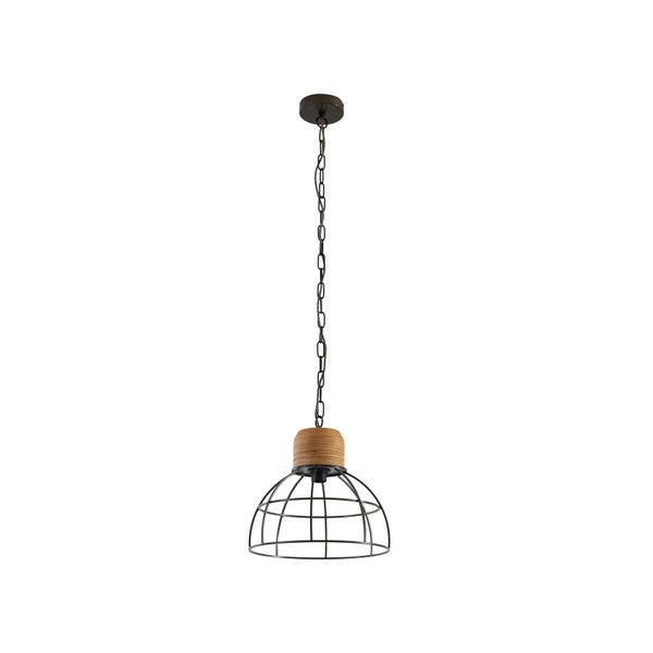 Die Hängeleuchte Arinthea besteht aus Eisen, Stahl und Holz. Sie wird mit E14