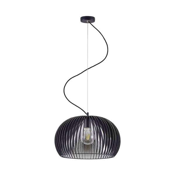 Die Hängeleuchte Jusra hat einen Käfigschirm in Schwarz mit Lamellen aus Metall, bei dem der Blick auf das Leuchtmittel frei ist.