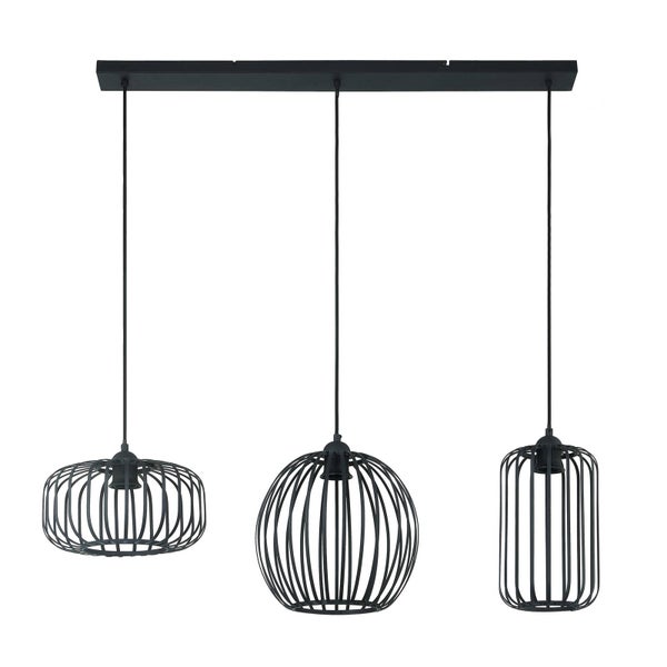 Die Pendelleuchte Krish ist ein Lichtspender, der gut zu Vintagestilen passt, denn die Leuchtenschirme sind in dekorativer Käfigoptik gehalten und in unterschiedlicher Form gestaltet. Die Oberfläche ist schwarz und das Lichtbild wird schön von den Käfigstäben beeinflusst.