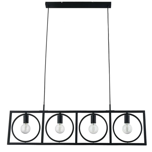 Die vierflammige Hängeleuchte Mateja besteht aus schwarzem Metall und besitzt vier Fassungen. Sie kann mit E27