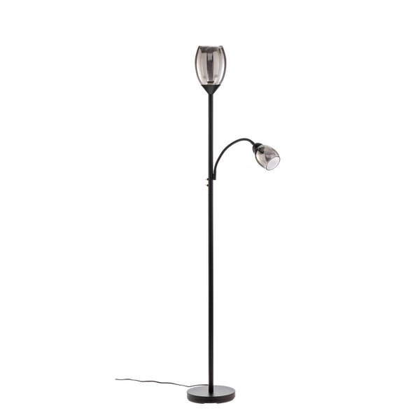 Die Stehleuchte Irmino wurde aus schwarzem Stahl hergestellt und besitzt Leuchtenschirme aus trendigem Rauchglas. Das integrierte Leselicht kann eine zusätzliche, zielgerichtete Lichtabstrahlung bieten.