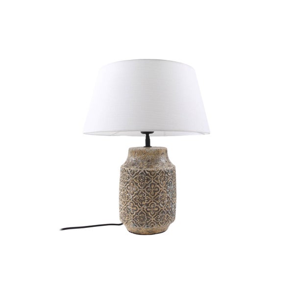 Die Tischleuchte Aelith besteht aus Keramik und Textil. Sie kann mit E27
