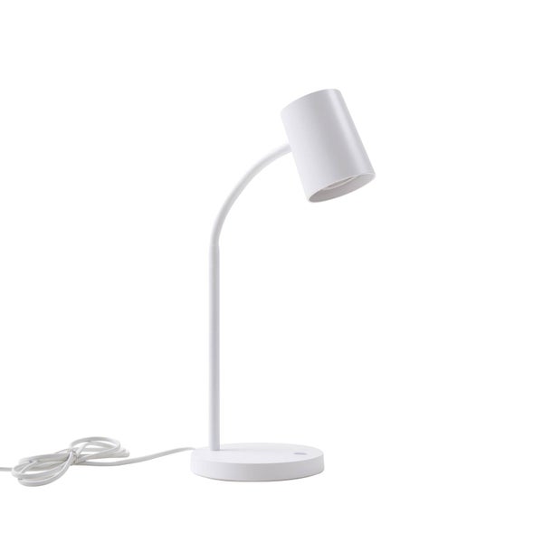 Die minimalistisch gestaltete Tischleuchte Radka ist mit einem Flexarm versehen, der es möglich macht, den Leuchtenkopf beliebig auszurichten. Am Fuß ist ein Schalter zur Bedienung integriert. Die Lichtstimmung kann durch die Wahl des GU10