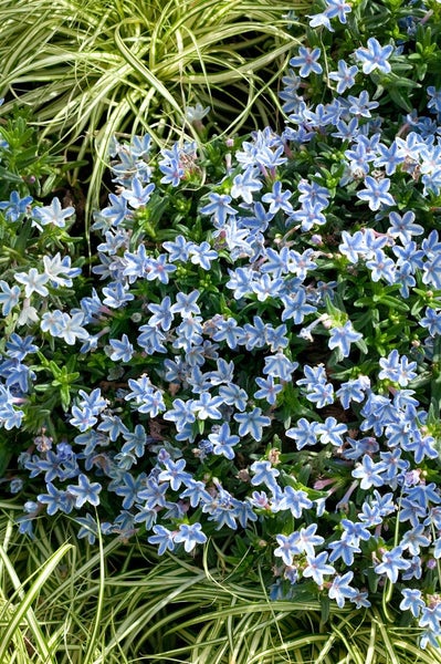 Lithodora diffusa ‘Star’, der immergrüne Blauer Steinsame, begeistert als kompakte Polsterstaude mit außergewöhnlich sternförmiger Zweifarbigkeit: intensiv himmelblaue Blüten mit strahlend weißem Zentrum erscheinen reich von Mai bis Juli und setzen sich wirkungsvoll vom dunkelgrünen, schmalen Laub ab. Der teppichbildende, niedrig wachsende Zwergstrauch erreicht etwa 10–15 cm Höhe und bildet dichte, breit kriechende Matten, die Beeteinfassungen, Steingärten und Trogbepflanzungen elegant umspielen. Als Bodendecker im Vorgarten, auf Mauerkronen, im Kiesgarten oder in Pflanzschalen auf Balkon und Terrasse entfaltet diese Steingartenstaude ihren ganzen Charme; einzeln als zierlicher Solitär oder in kleinen Gruppen gepflanzt entsteht ein homogener, farbstarker Blütenteppich mit sehr natürlicher Anmutung.